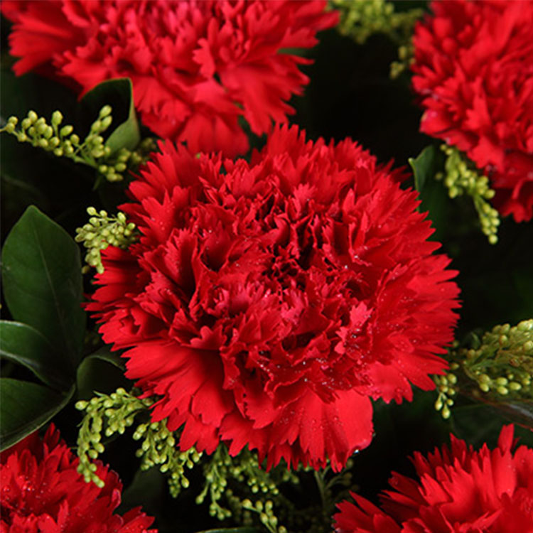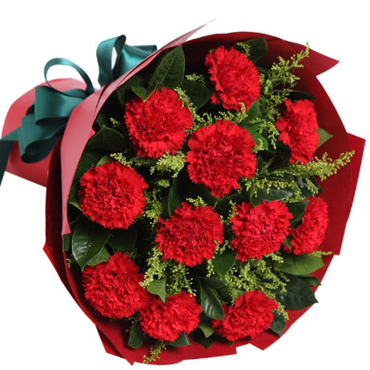 红色康乃馨11枝+黄莺10枝+栀子叶精美包装纸包装,蝴蝶结扎束