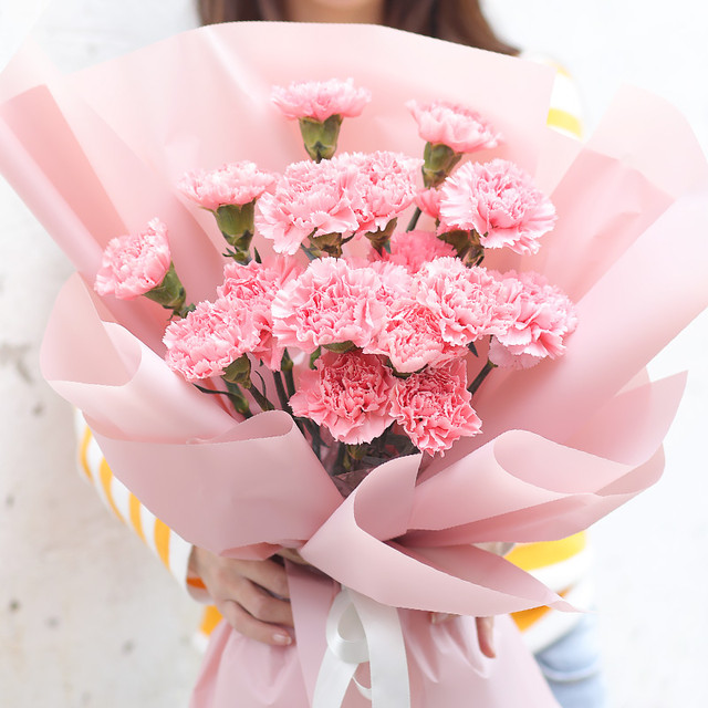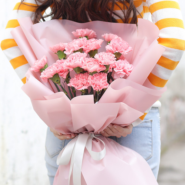 19枝粉色康乃馨,包装纸精美包装,蝴蝶结扎束