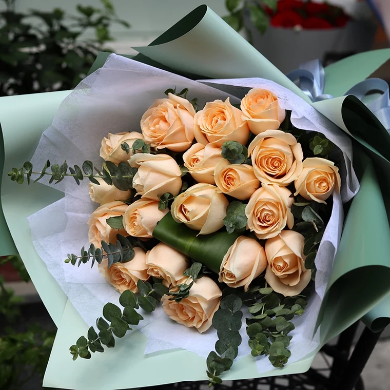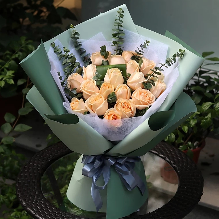 18朵香槟玫瑰花配绿叶,精美包装纸包装,蝴蝶结扎束