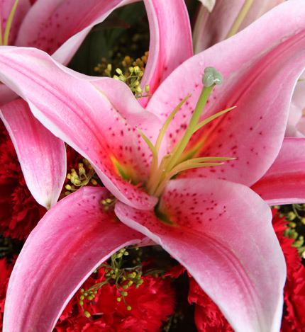 材 料:6朵百合花(3枝)粉色百合花,29枝红康乃馨,适量黄英搭配