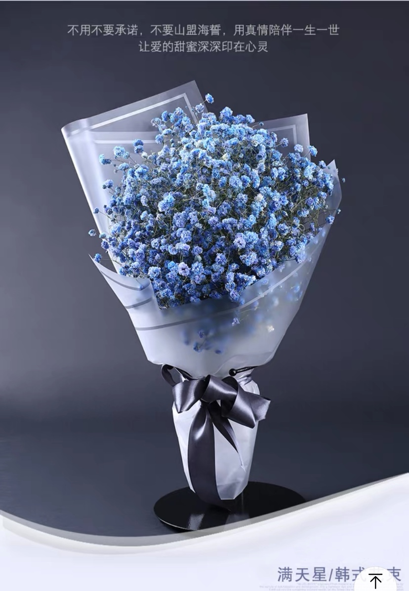 蓝色的满天星的花语是真心喜欢你,又叫六月雪。它是清雅人士喜爱的花卉,有致远,清纯,浪漫的意思。
