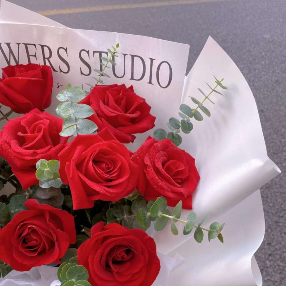 不期而遇/11朵红玫瑰花配尤加利精美花束包装