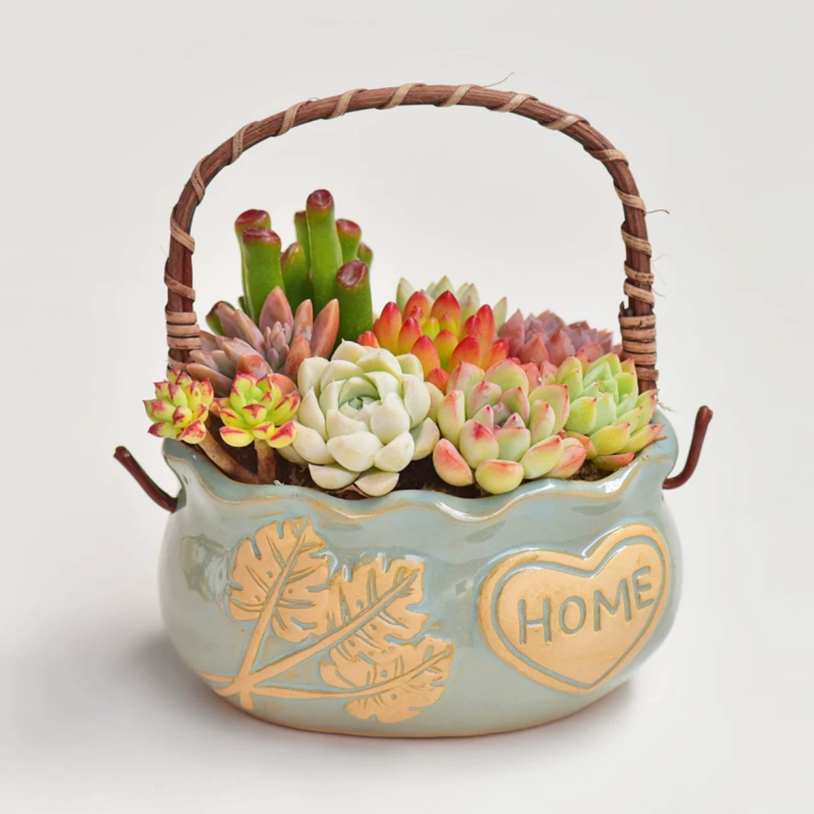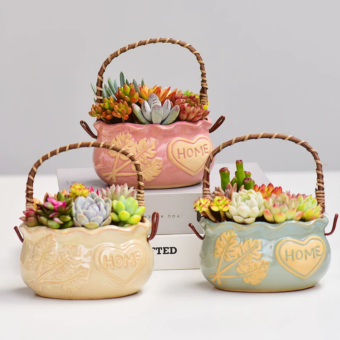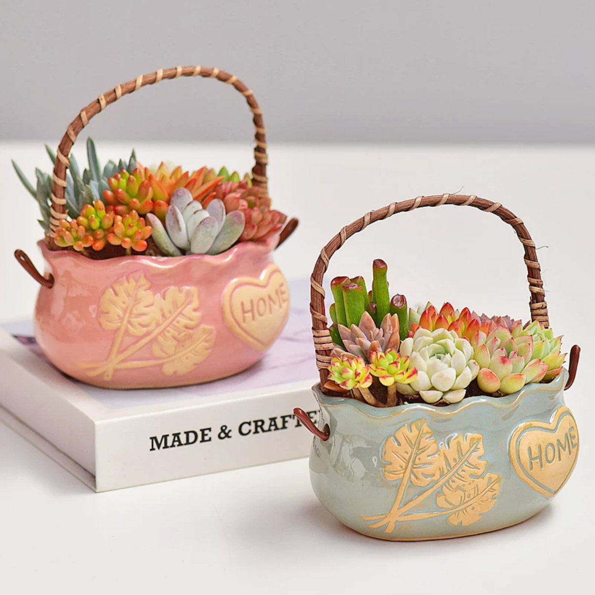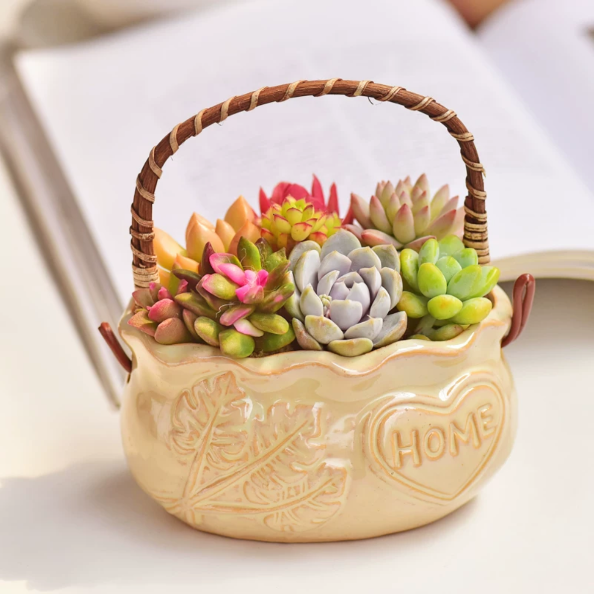 陶瓷手提篮多肉植物组合盆栽办公室内桌面花卉礼品小摆件好看好养