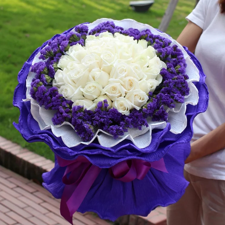 29朵白玫瑰花+紫色勿忘我,精美包装纸精美包装,蝴蝶结扎束
