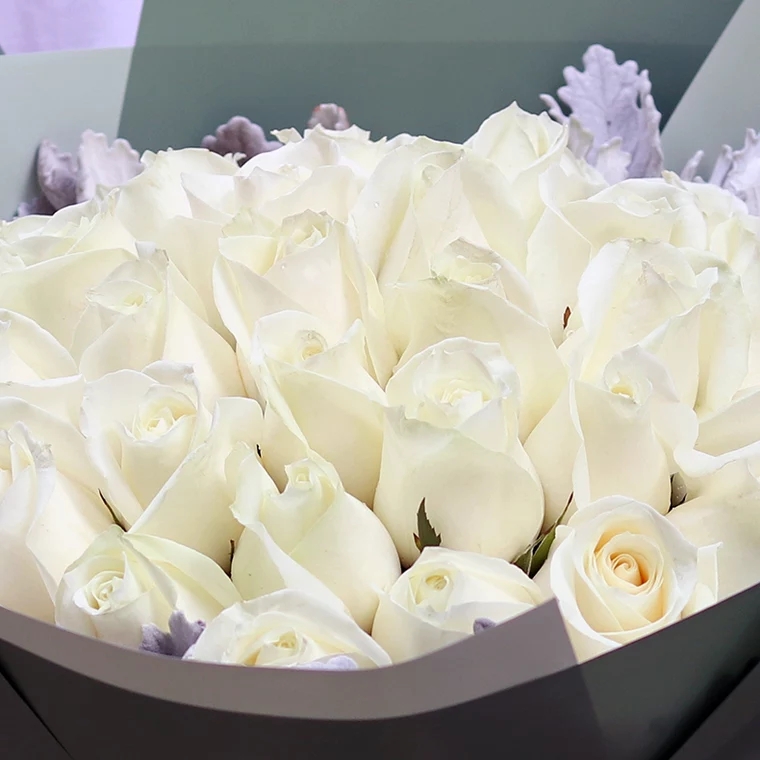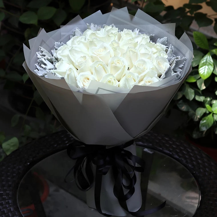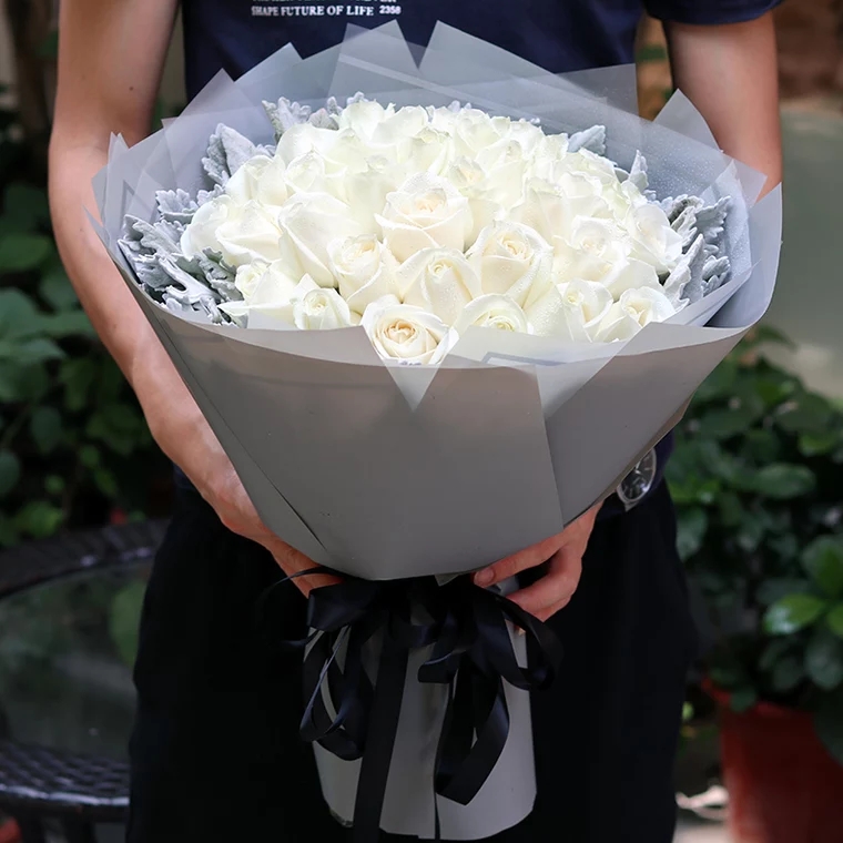 29朵白色玫瑰花,精美包装纸包装,蝴蝶结扎束