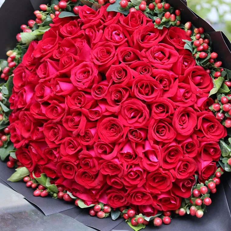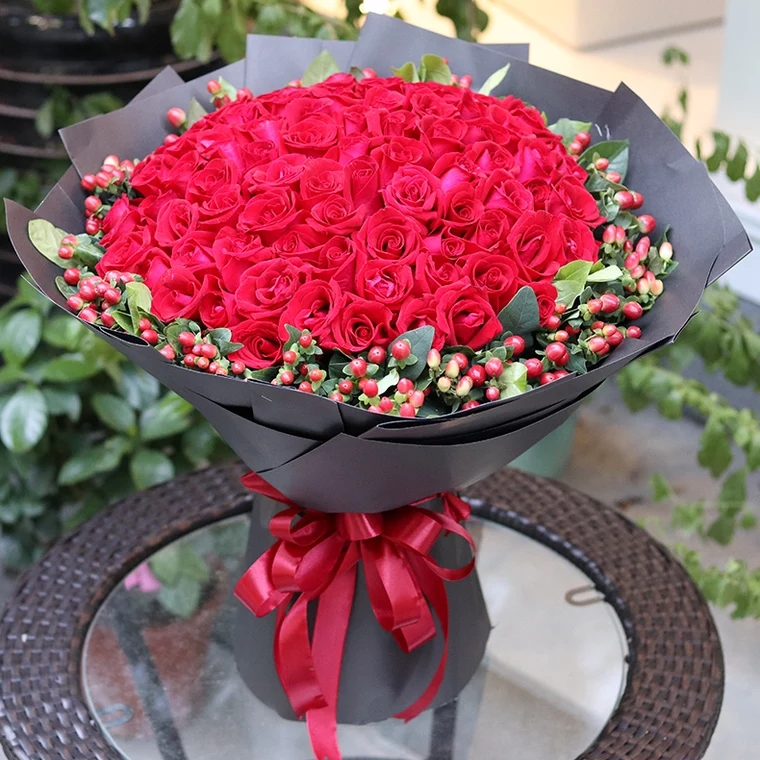 99朵红色玫瑰花,精美包装纸包装,蝴蝶结扎束