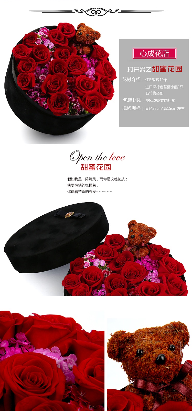 甜蜜花园——18朵红玫瑰花配苔藓小熊高档礼盒盛放