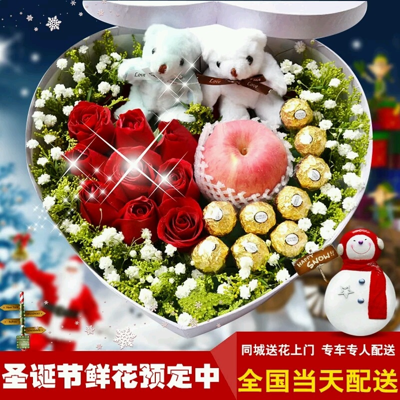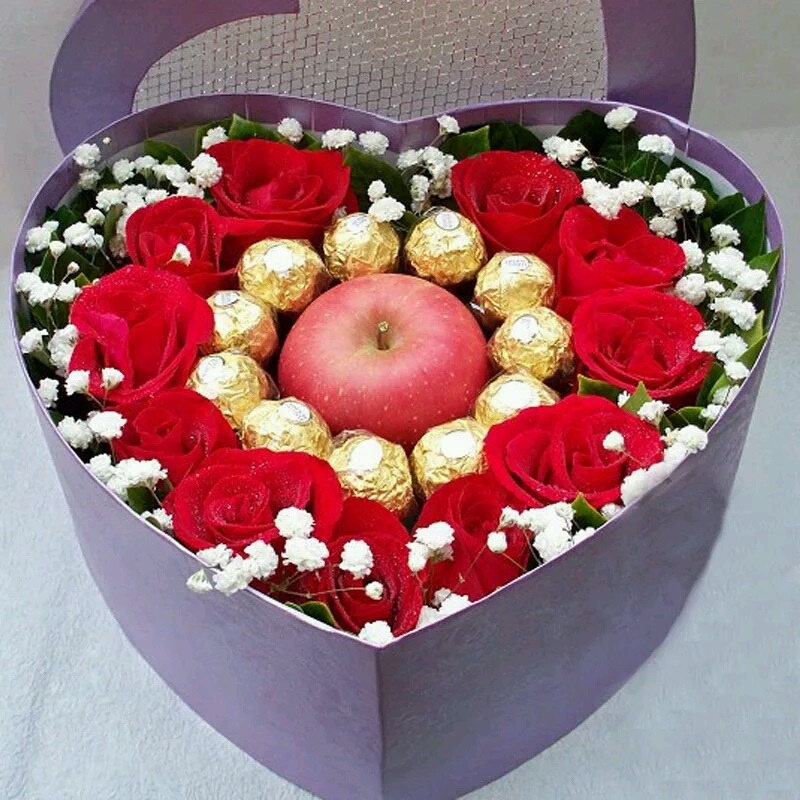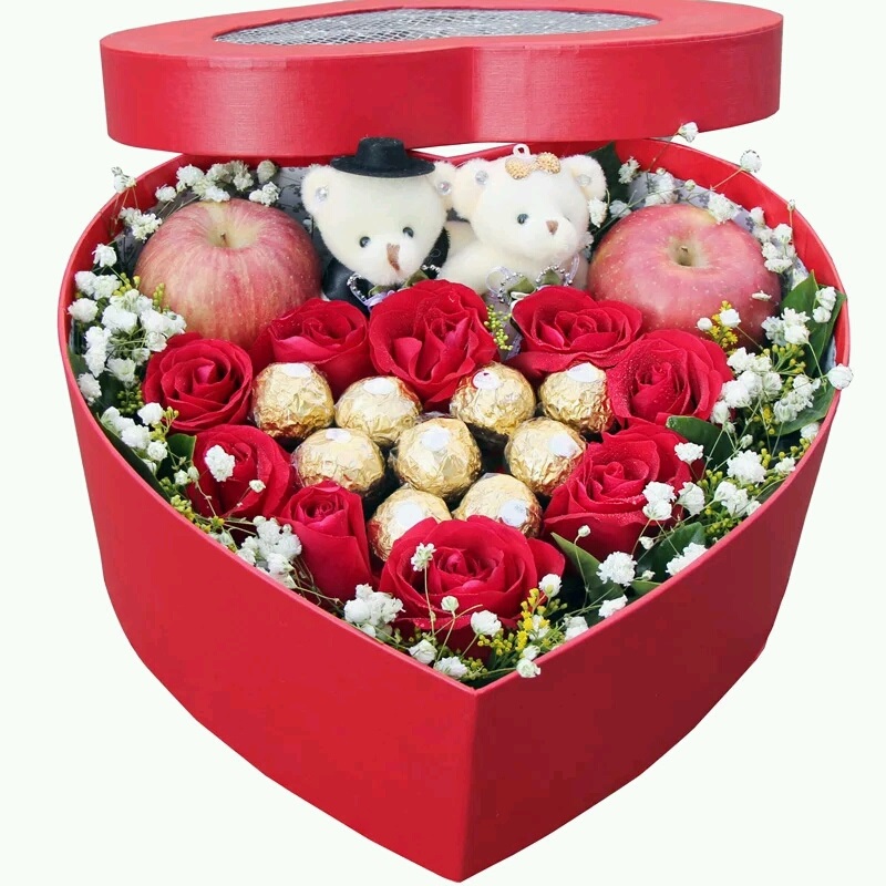 11朵红玫瑰+9颗费列罗,+2个小熊 配精美心形礼盒盛放