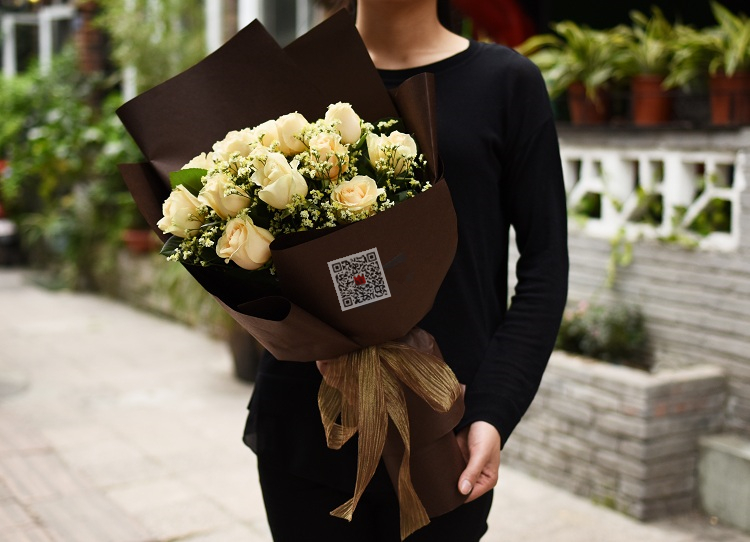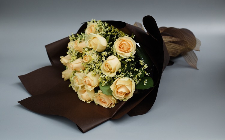 拥抱幸福/18朵香槟玫瑰花配水晶草精美花束包装