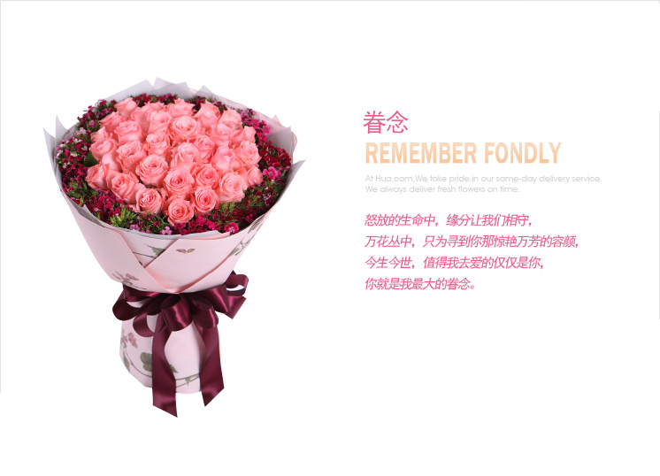眷念/33朵戴安娜玫瑰花配石竹梅精美包装/生日情人节祝福礼物/同城花店送花上门