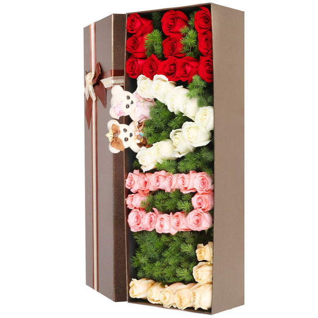 39朵精品混搭玫瑰,一对情侣小熊,蓬莱松搭配