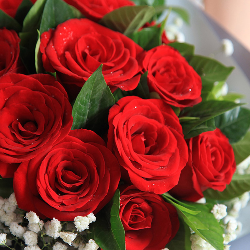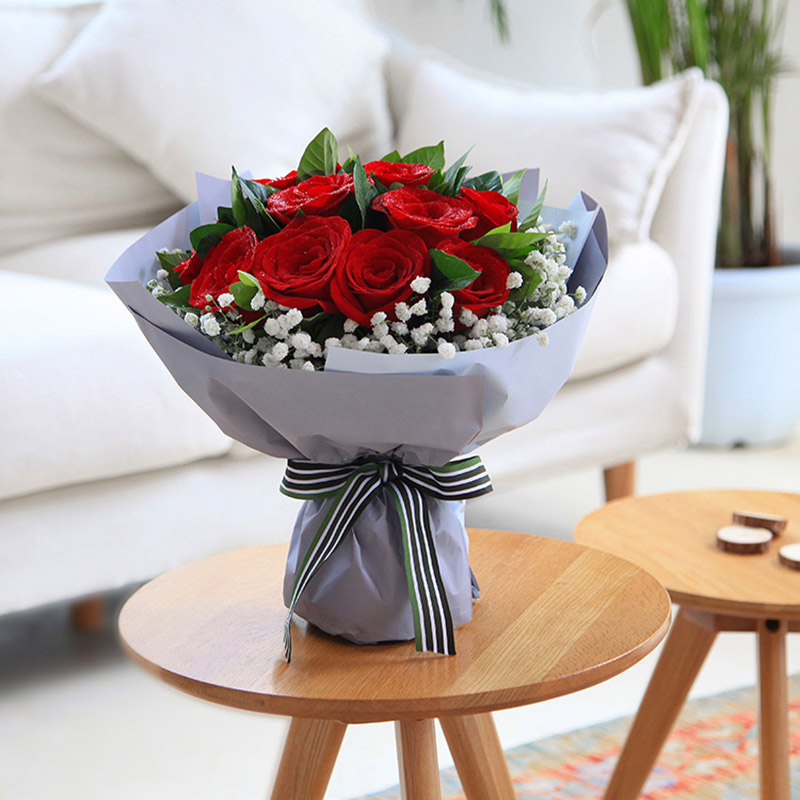 红玫瑰11枝+满天星+栀子叶,精美花束包装