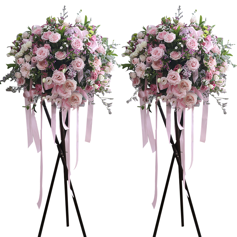 精品粉玫瑰、白色洋桔梗、粉色洋桔梗,搭配适量粉色相思梅、紫色相思梅、白色相思梅、情人草、绿叶、黄莺草。