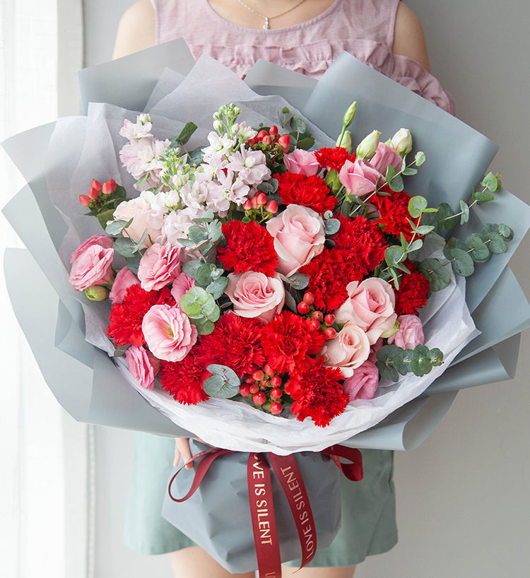 你是我最柔的牵挂,我是你最硬的铠甲!12朵红色康乃馨,6朵粉玫瑰(粉佳人)、3头或以上粉色洋桔梗5枝、粉色紫罗兰3枝(缺货时用相似线状花材替代)、红豆5枝配尤加利
