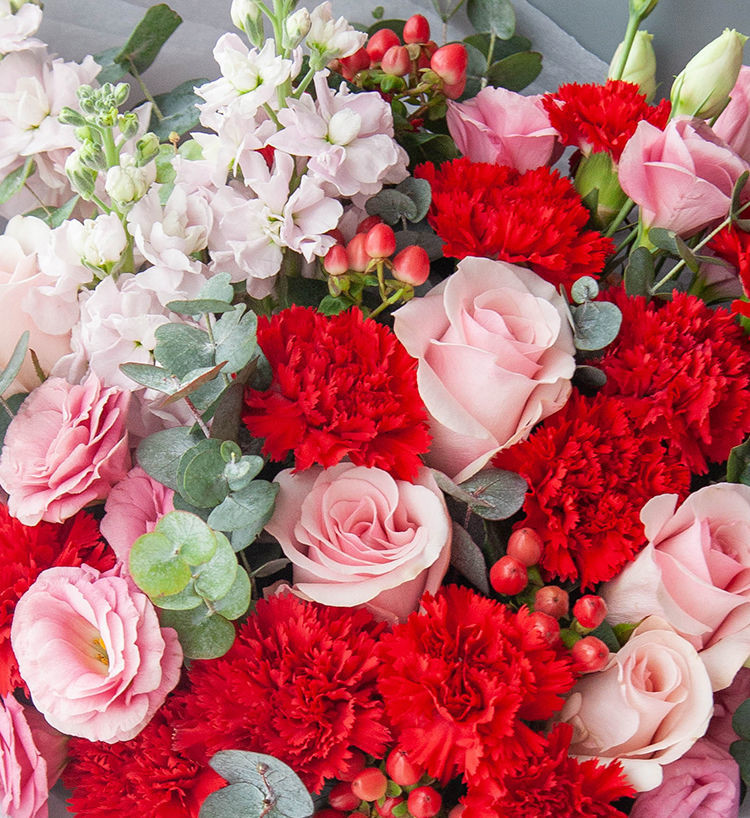 牵挂你/12朵红色康乃馨,6朵粉玫瑰花(粉佳人)、5朵粉色洋桔梗、3枝粉色紫罗兰、红豆5枝 配尤加利