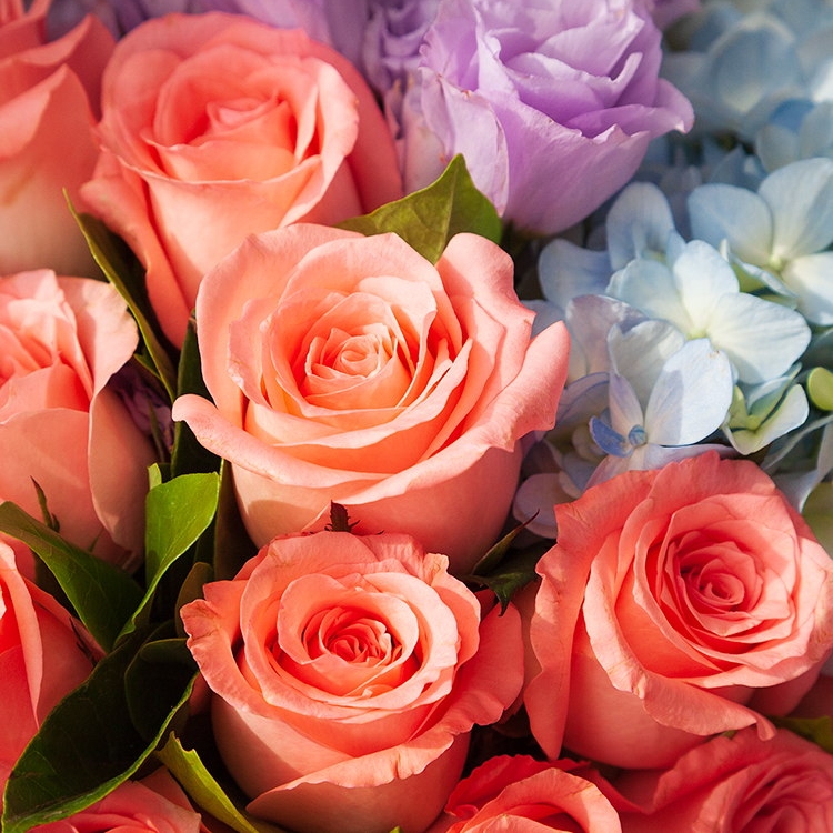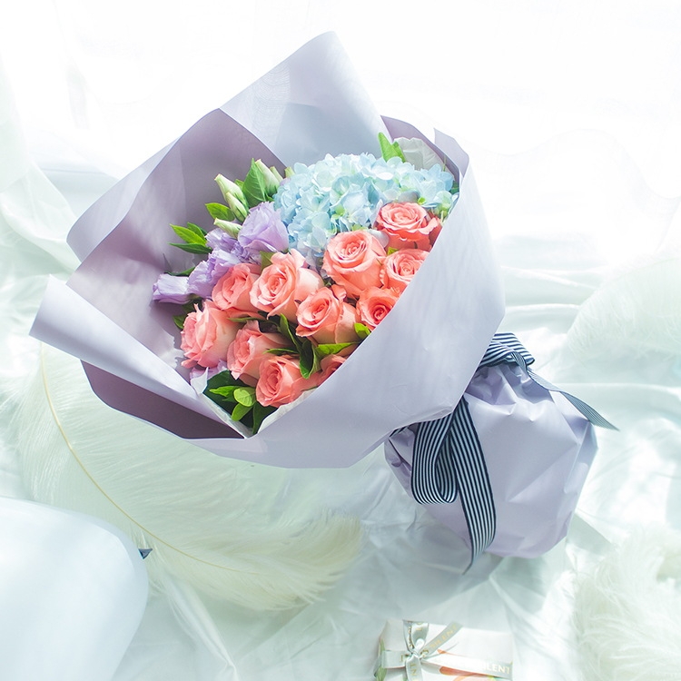 爱情故事/11朵粉玫瑰花配绣球花搭配洋桔梗精美花束包装