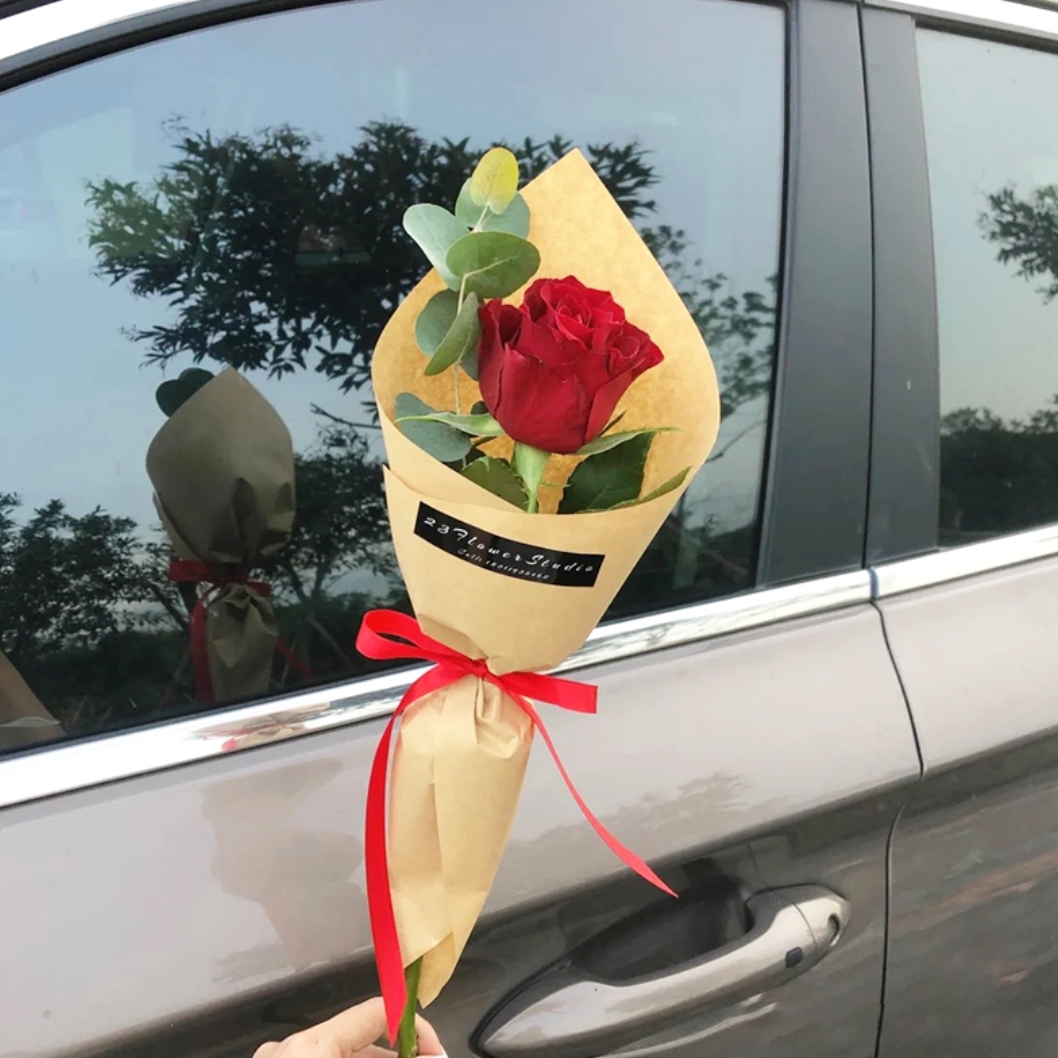 眷恋-1朵红玫瑰花配尤加利精美冰淇淋花束包装
