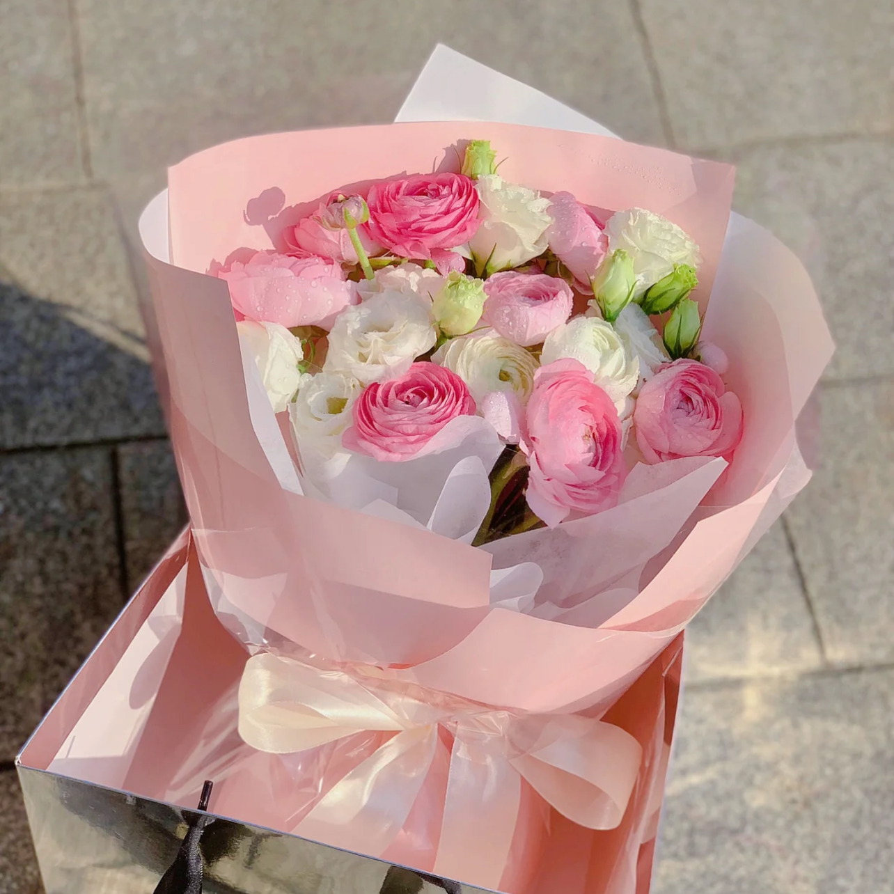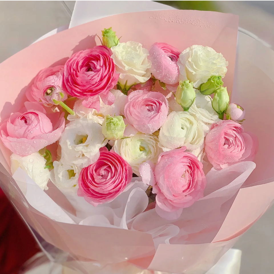 粉嫩少女/粉色白色洋牡丹配洋桔梗精美花束包装
