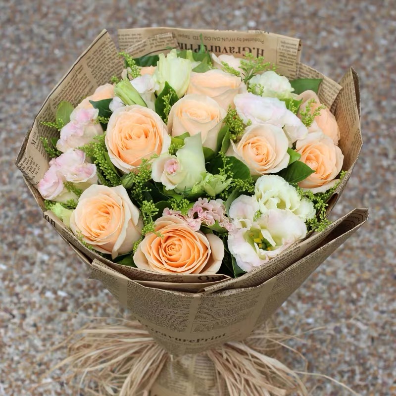 11枝香槟玫瑰+洋桔梗+黄莺,精美英文报包装